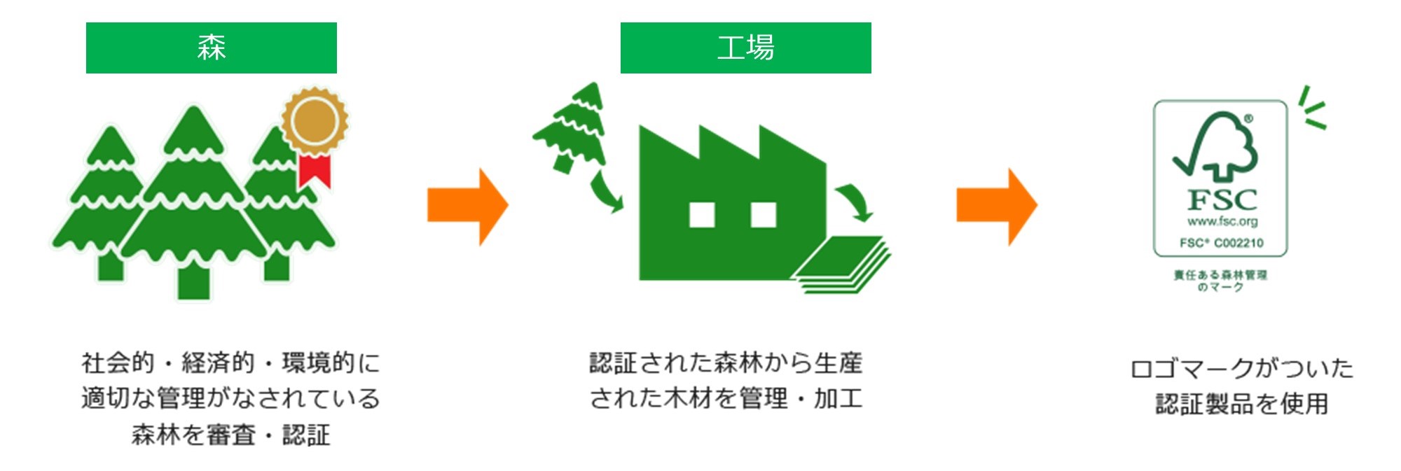 「FSC認証」は、適切に管理された森林から生産された林産物や、その他のリスクの低い林産物を使用した製品を目に見える形で消費者に届ける仕組みです。森林から印刷までの全工程の認証をクリアした製品にはロゴマークが付与されます。日常生活でも、お菓子のパッケージやノートなどで目にする機会が多いマークです。認証製品を選ぶことで、消費者は適切な管理の上で利用される森林を支援し、森林保全に貢献できます。